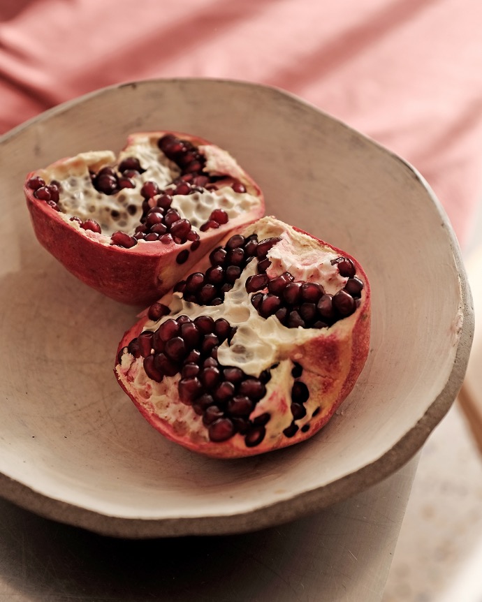 Blanch the leaves briefly so they keep their deep green colour, then add pomegranate seeds and thin slices of Mandela.