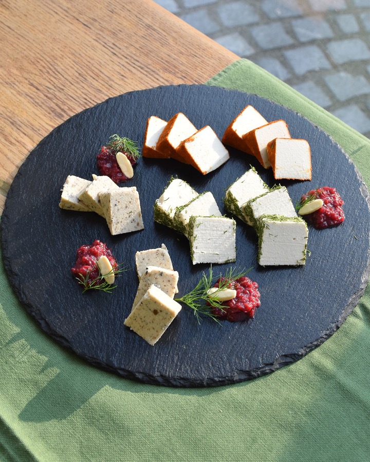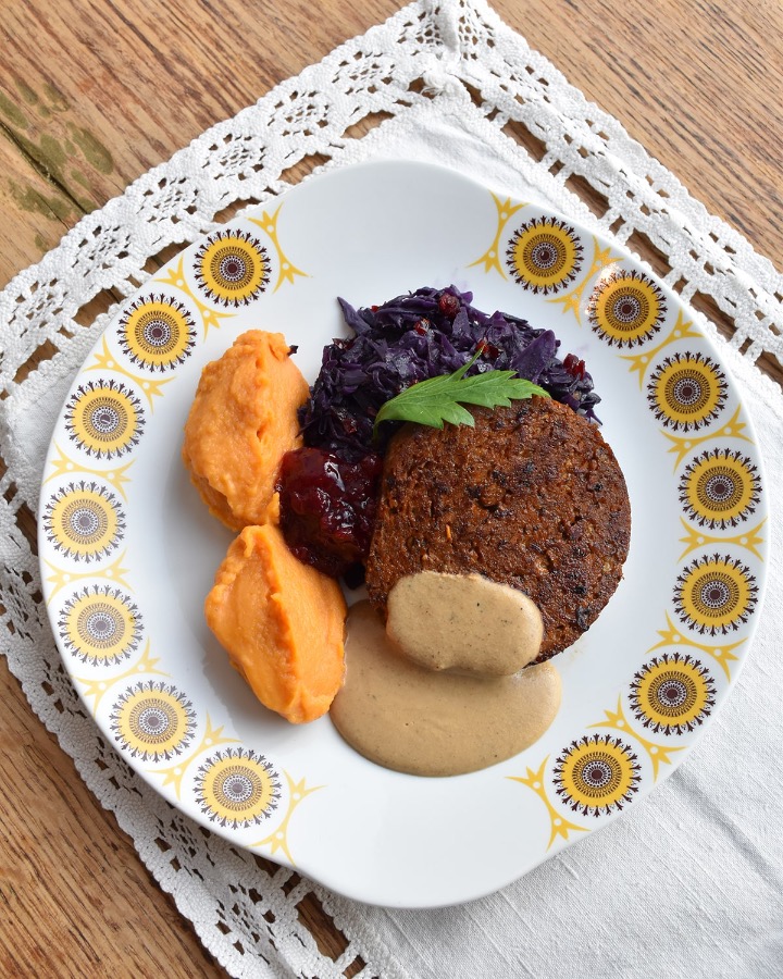 Main dish – koji patty with dried fruits and winter spices, sweet potato purée, Brussels sprouts, truffle sauce, cranberry jam – €15.50