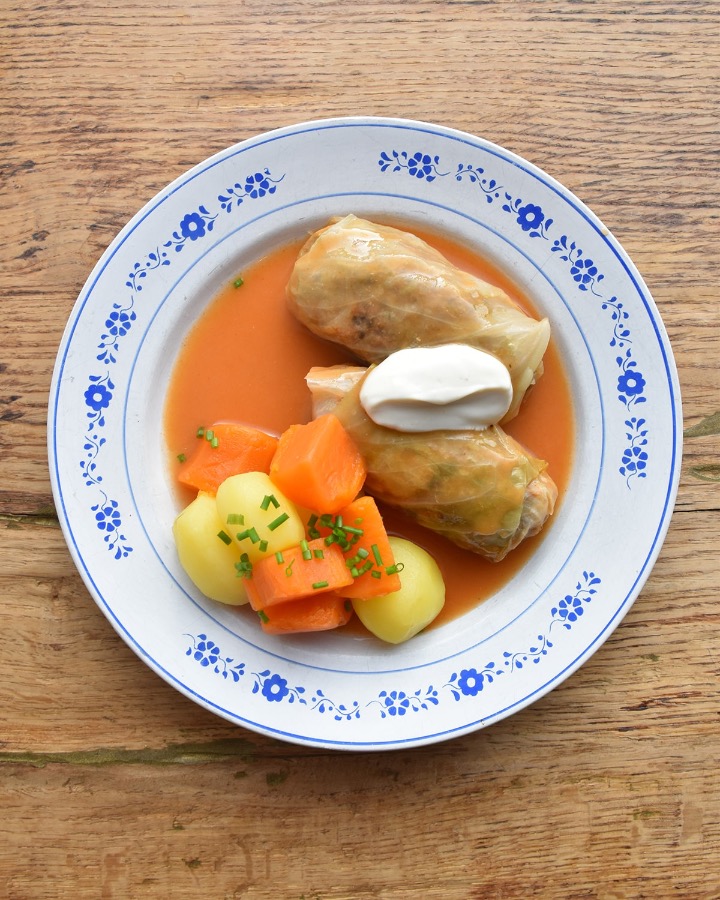 Main dish – stuffed cabbage rolls filled with koji and rice in a rich sauce, sweet potato purée, roasted romanesco, soy yoghurt – €14.00