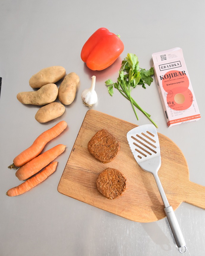 - Krompir narežemo na krhlje, papriko na trakove, korenje na kolobarje ali paličice.
