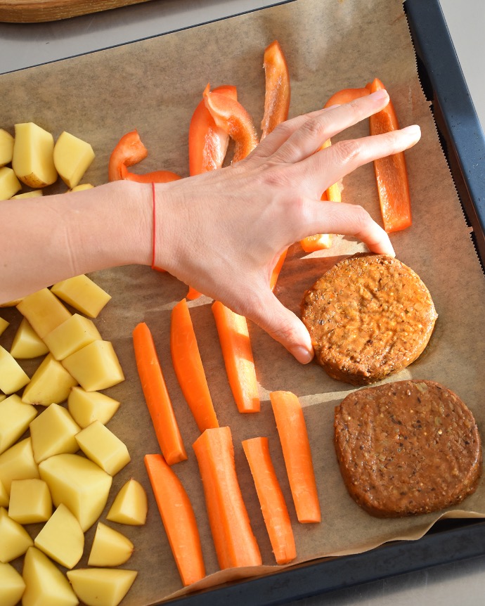 - Zelenjavo razporedimo po pekaču, pokapamo z olivnim oljem ter začinimo.
